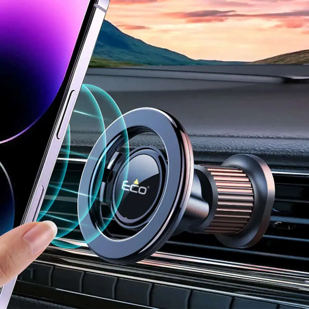 מעמד מגנטי עוצמתי לרכב מבית ECO, נצמד לפתח המזגן, תומך בטכנולוגיית MagSafe למכשירי אייפון 12 והלאה. הערכה כוללת זוג טבעות מתכתיות לבעלי טלפונים חכמים ממותגים אחרים.